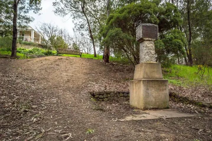 Today, Poverty Point (located at 414 Main Road) is a quiet little park with shade trees, a walking path, an info sign and a granite obelisk erected in 1941, marking the discovery.
